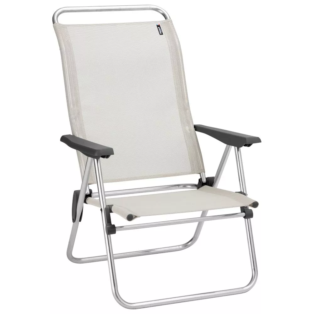 Der Camping-Klappsessel Lafuma Alu Low bietet mit seinem geringen Gewicht sehr viel Komfort. Er ist sehr funktional und lässt sich leicht transportieren, sodass Sie den Stuhl überall mit hin nehmen können. Die ergonomische, hohe Rückenlehne mit Lendenwirbelsützen unterstützt Sie bei einer gesunden Sitzhaltung. Zusätzlich ist die Rückenlehne über die Armlehnen in 5 verschiedene Positionen verstellbar. Die Monoblock-Armlehnen aus Harz haben ebenfalls eine ergonomische Form. Mit diesem Klappstuhl können Sie sich tief entspannen und die Sonne geniessen, egal ob im Campingurlaub, am Strand oder in Ihrem Garten.