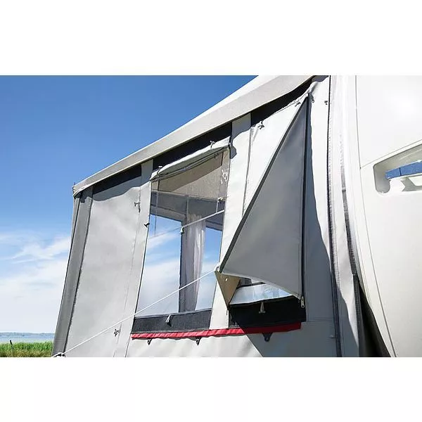ist ein Ausgleichselement um die leicht schräg gestellte Vorzelt-Seitenwand an einen aerodynamischen Bugverlauf am Fahrzeug ausgleichen zu können. Sie steigert die Passform des Zeltes. Damit behält die rechte Seitenwand des Zeltes ihre konstruktiv vorgegebene Neigung, die für einen Erkeranbau notwendig ist. Die doppelte Windecke und die Seitenwand verfügen über einen separaten Einzugskeder, so dass wahlweise beim Zeltaufbau entschieden werden kann. - Robuste Reissverschlüsse: